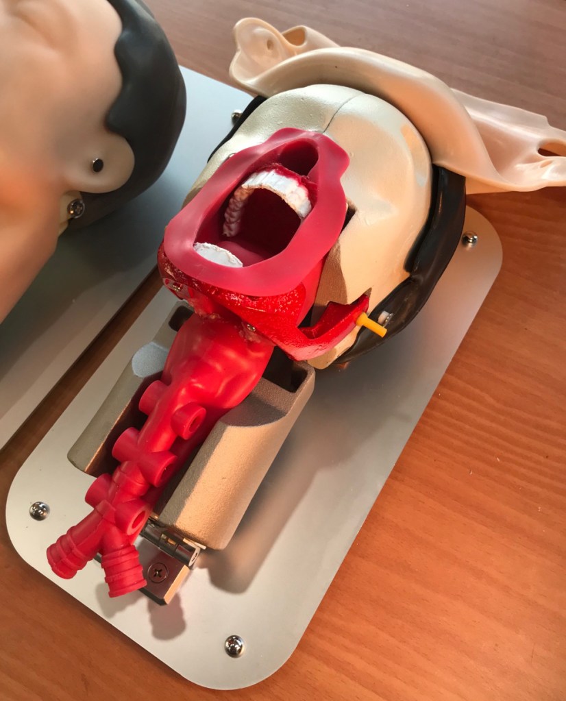 Intubation training using existing blades, intubation training by laryngeal mask, as the like all types of intubation training are possible, and intubation training through nasal cavity is also possible. As an option to purchase, intubation training in the case of tooth damage alarm and Tongue Edema simulation exercise is also possible. The model airway tube is made of special silicone, so it is durable, and the soft material is kept at Shore A 0, and in case of damage, the only airway tube could be replaceable.